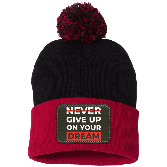 Never Give Up On Your Dream Motivational Inspirational Pom Pom Knit Cap - Patch