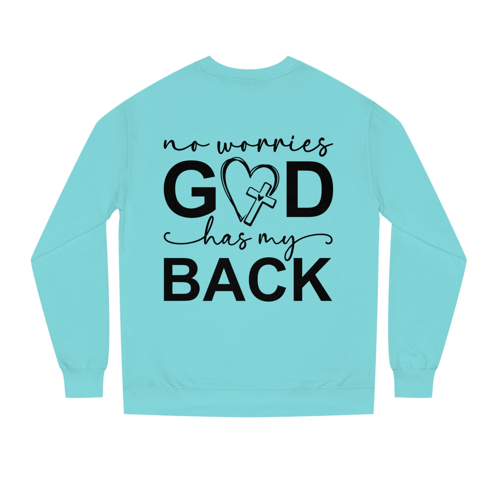 - Back: The phrase "No worries God has my back" is boldly displayed, with the "O" in "God" creatively replaced by the same heart logo as on the front. It’s a statement of faith and reassurance that resonates deeply.