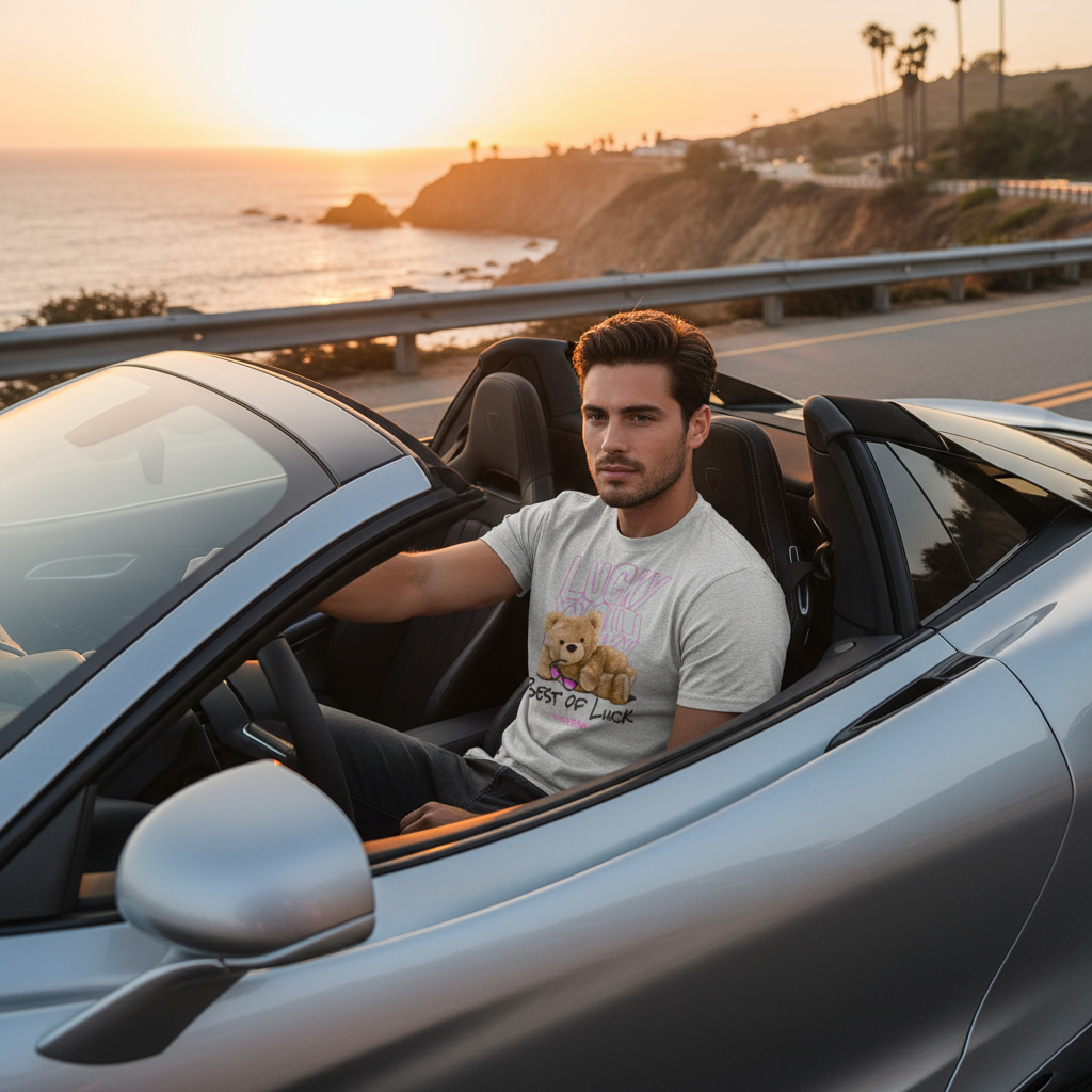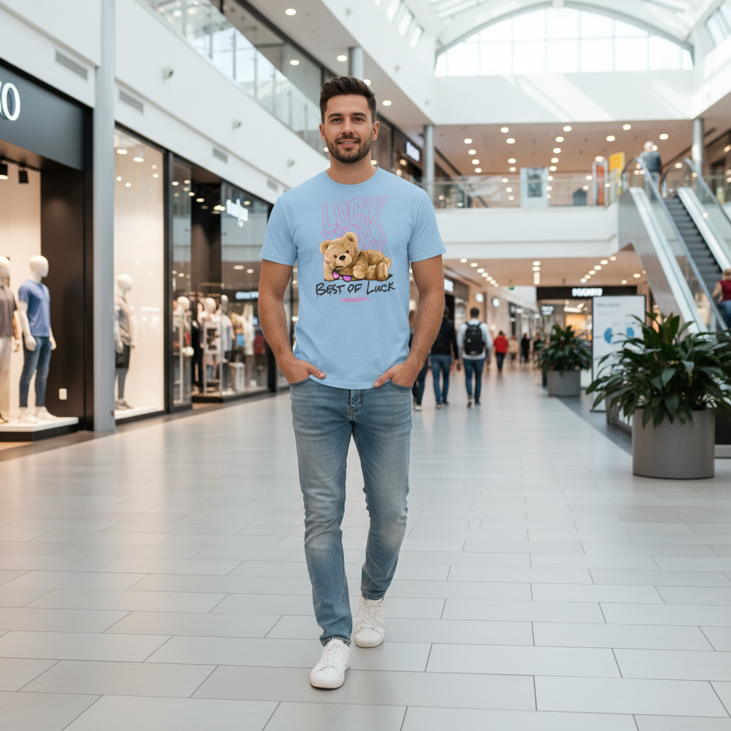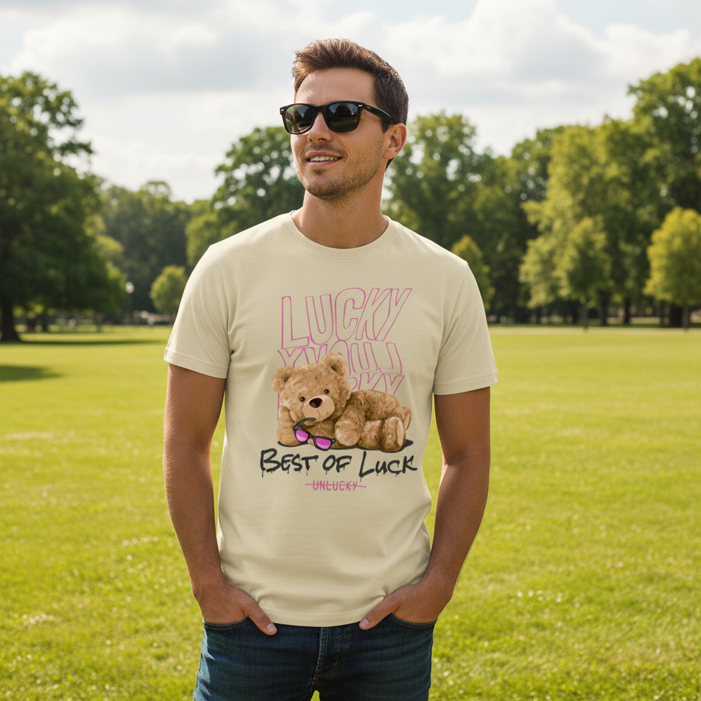 Step into your confident, playful side with the Lucky or Not – Best of Luck Teddy Edition Tee. This design features a flirtatious teddy bear laying on his side, biting the rim of his glasses like he knows something you don’t. Behind him, the word LUCKY repeats three times — flipped, mirrored, and warped like ripples in water — symbolizing that luck doesn’t always play by the rules.
